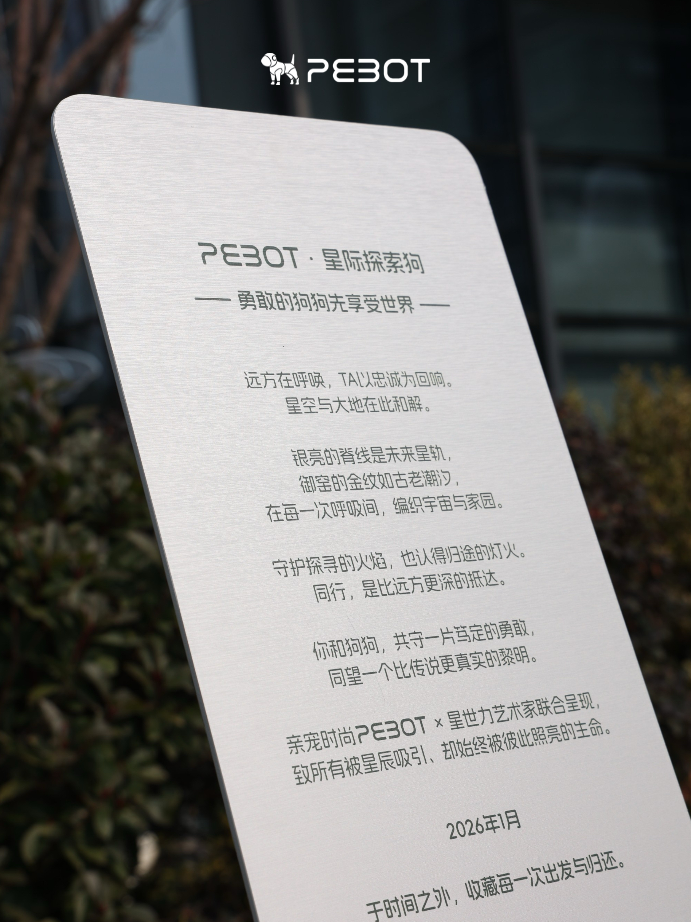 雕塑的铭文阐释了其精神内核:“远方在呼唤,TA以忠诚为回响。”这不仅是艺术表达,更是PEBOT“浩瀚星途,与你同程”品牌理念的立体宣言——最遥远的探索,始终源于最温暖的陪伴。